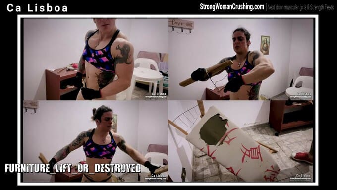 CaLisboaCa Lisboa uses her brute strength and smashes an ironing table leaving only pieces behind. Ca Lisboa shows how muscular and powerful she is by leaving a trail of destruction in this video.