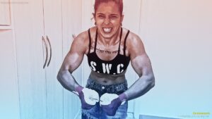 SassenachSassenach, muscular woman in pink shirt flexing for viewers who love strong women!