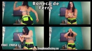 bonecaBoneca de Ferro shows her muscles and power, flexing and smashing a mobile phone with her hands.