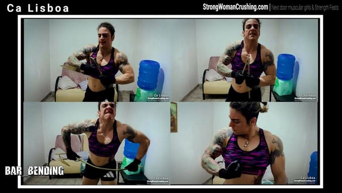 CaLisboaCa Lisboa shows her superior strength by bending a big metal chunk using her muscles and power