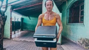 fabiFabi flexes her sexy muscular physique and crushes apples into juice using her power.