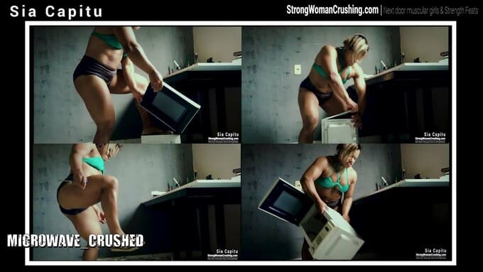 Sia Capitu uses her strength and muscular arms to destroy a microwave