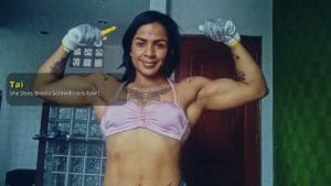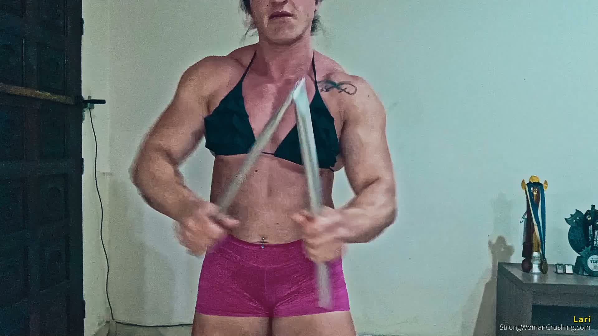 LariLari flexed her impressive biceps as she bent the metal with ease. Her strength was remarkable, making it seem like bending the pieces of metal was effortless for her. She truly is a muscle girl with feats of strength.