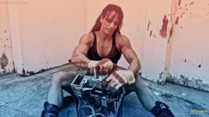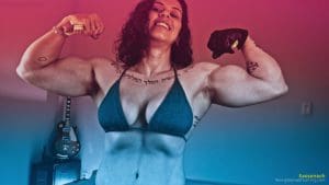 Sassenach crushes a metal cup with her immense biceps while using a swimsuit