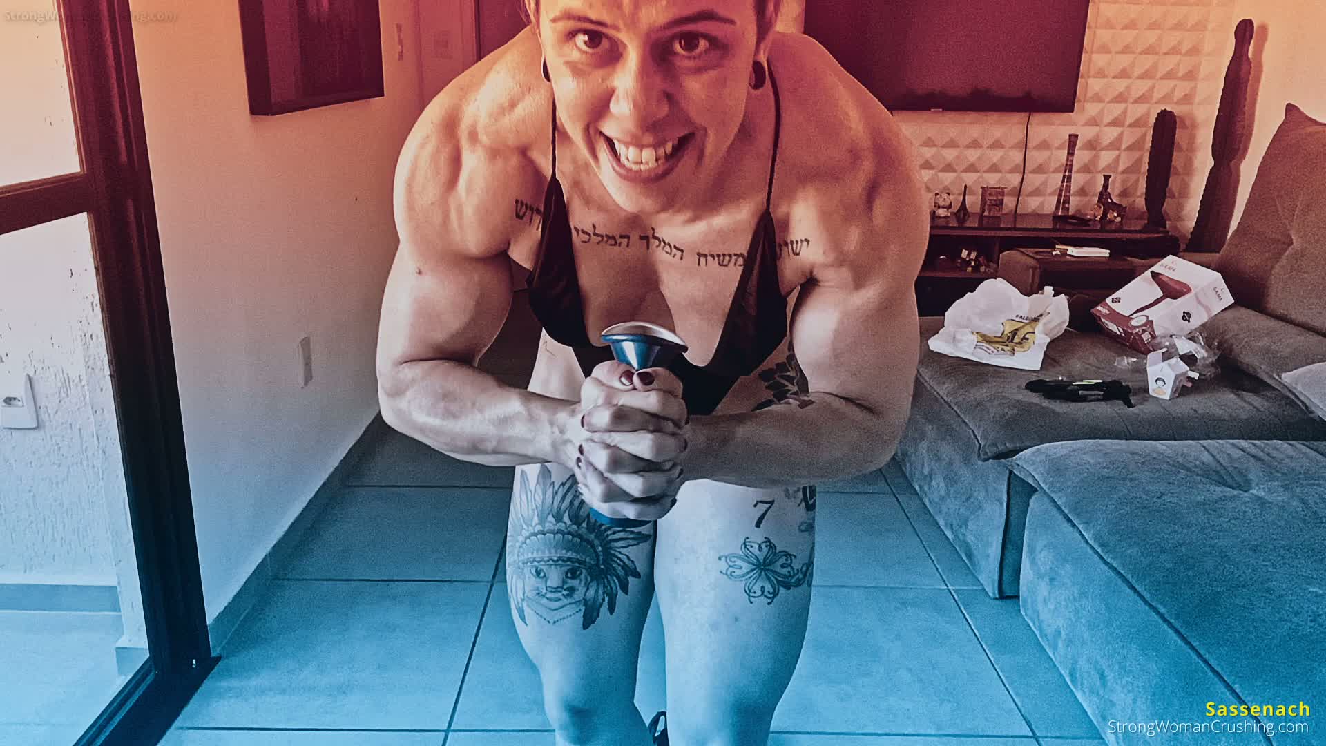 SassenachSassenach biceps bulged with power as she quickly crushed a metal cup while wearing a swimsuit. Her amazing feats of strength showcased her incredible female muscle, which will leave everyone in awe.