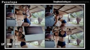 PenelopePenelope flexes her biceps, revealing her impressive muscular arms. She then proceeds to crush a metal pan with ease, demonstrating her immense strength.