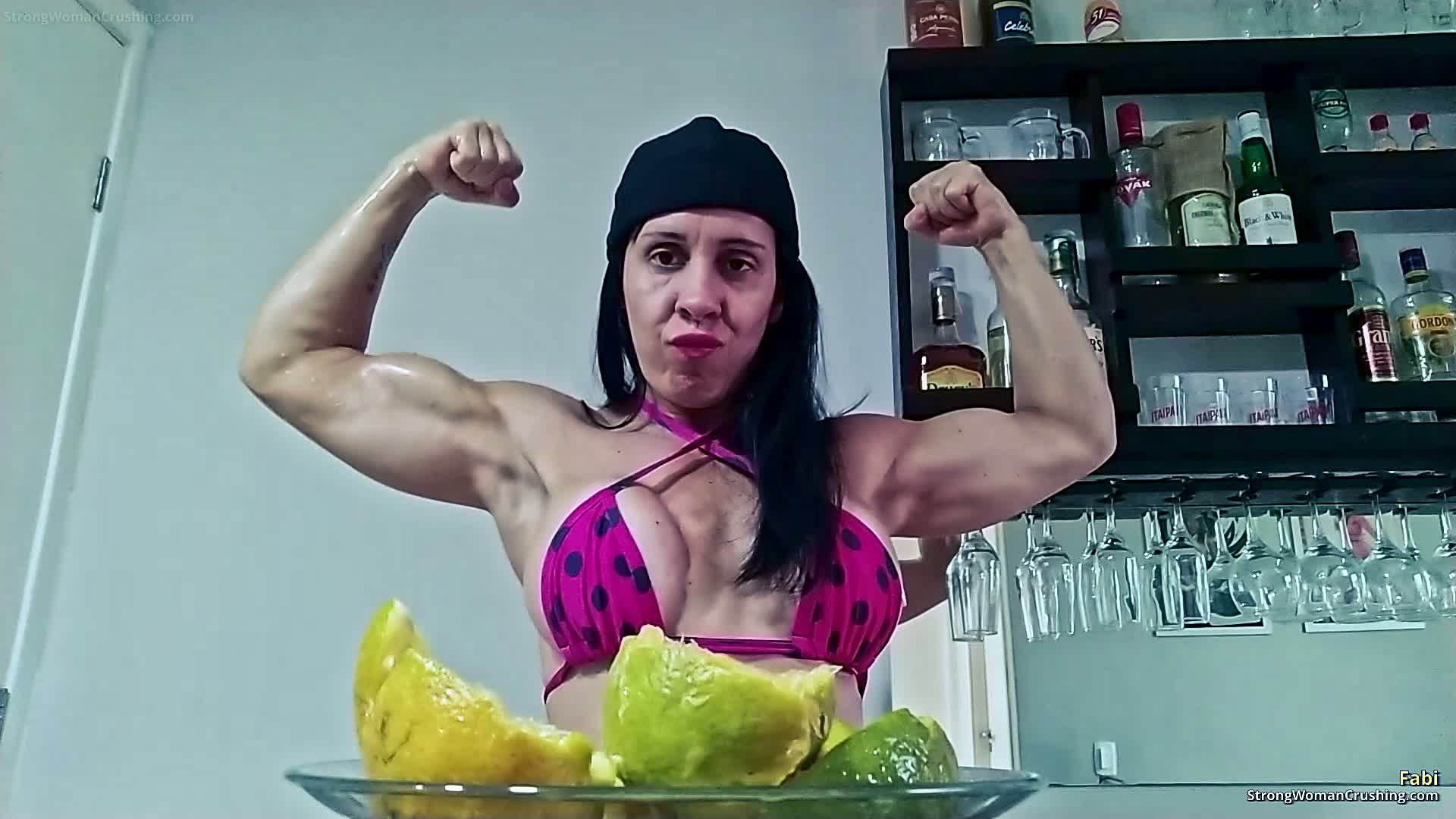 Fabi, a powerhouse of muscle, unleashes her incredible might as she effortlessly crushes oranges with her toned physique. Witness the mesmerizing combination of power and beauty as Fabi is muscles ripple with each squeeze, transforming ordinary citrus into tantalizing orange juice. This tantalizing experience is a must-watch for men who have an appreciation for the raw strength and allure of muscular women.