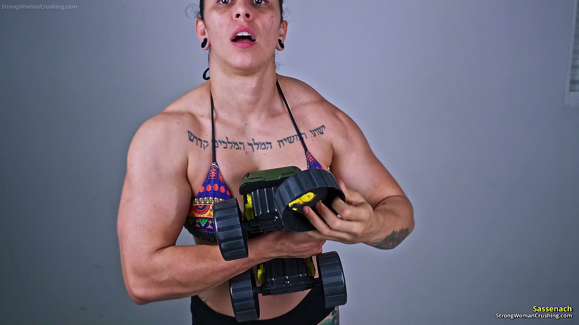 She uses her muscles and strength to press a toy truck against them until it breaks apart, then keeps crushing it until only pieces are left.