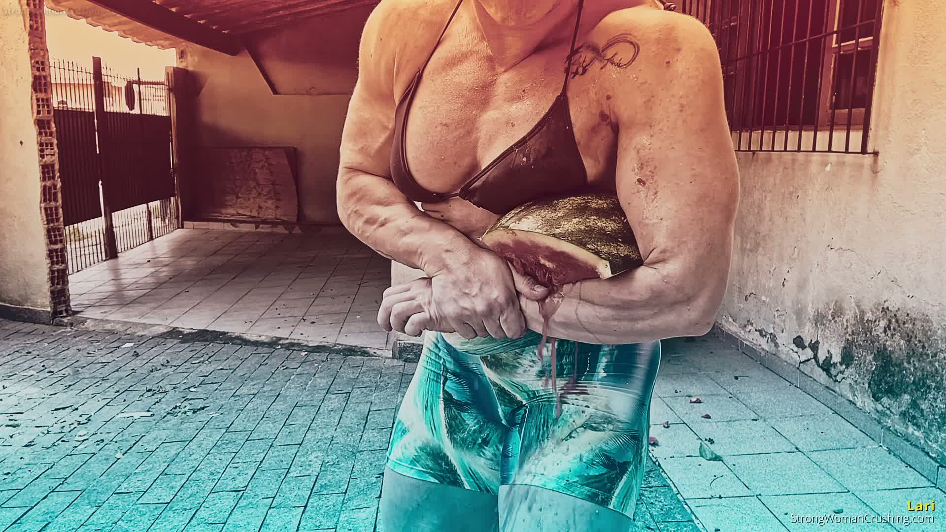 Caroline uses her muscular arms and strength to squeeze a cantaloupe