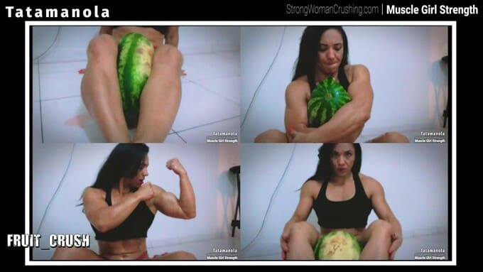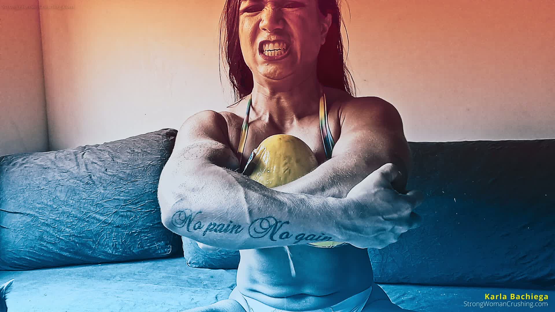 Caroline uses her muscular arms and strength to squeeze a cantaloupe