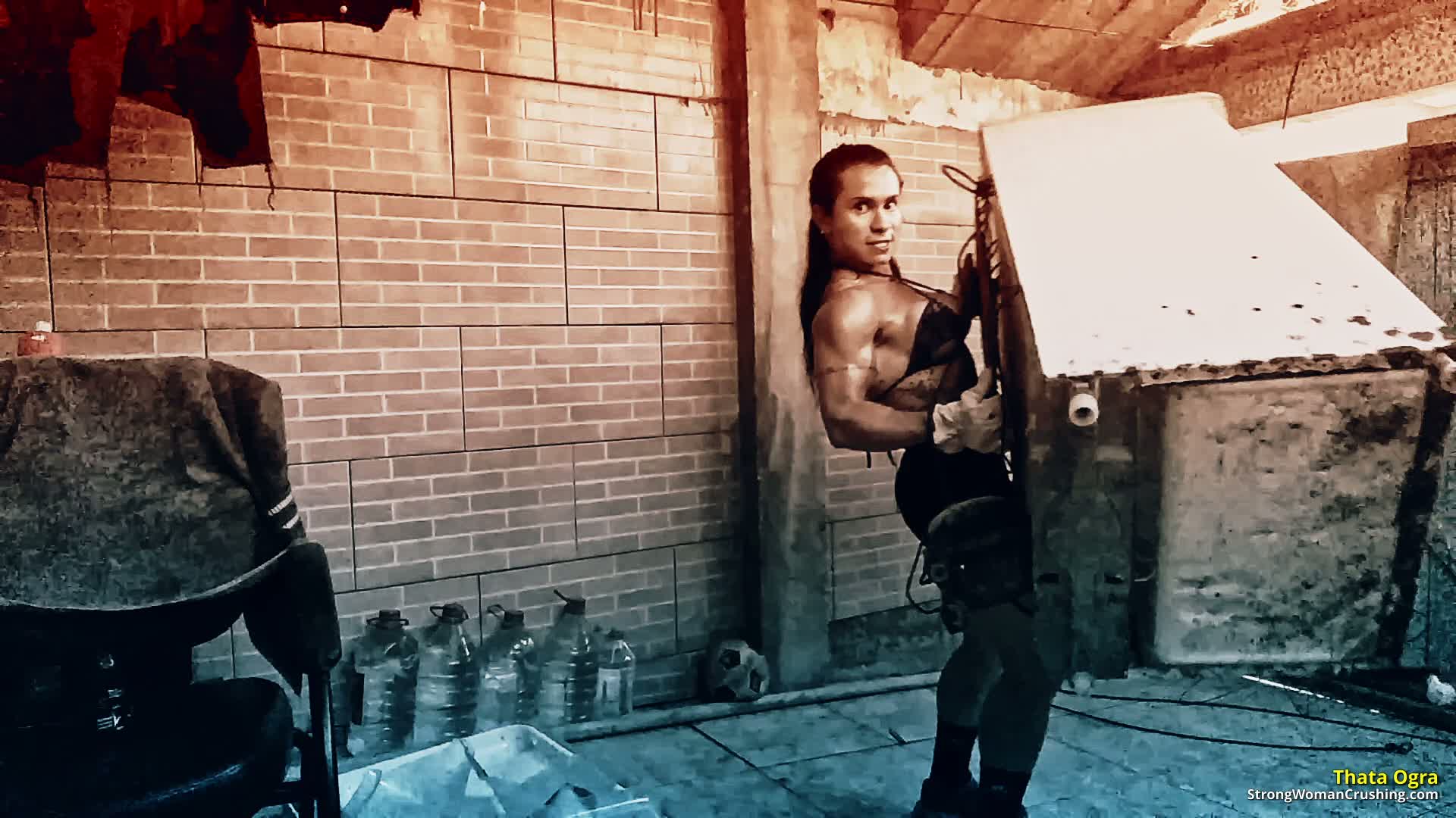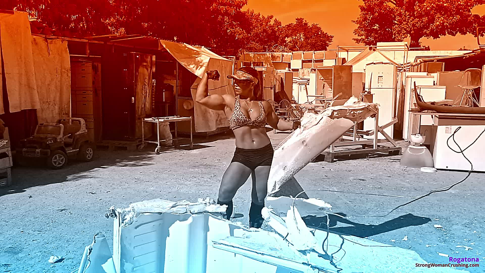 Muscular girls lifting and destroying a refrigerator using her muscles and strength.